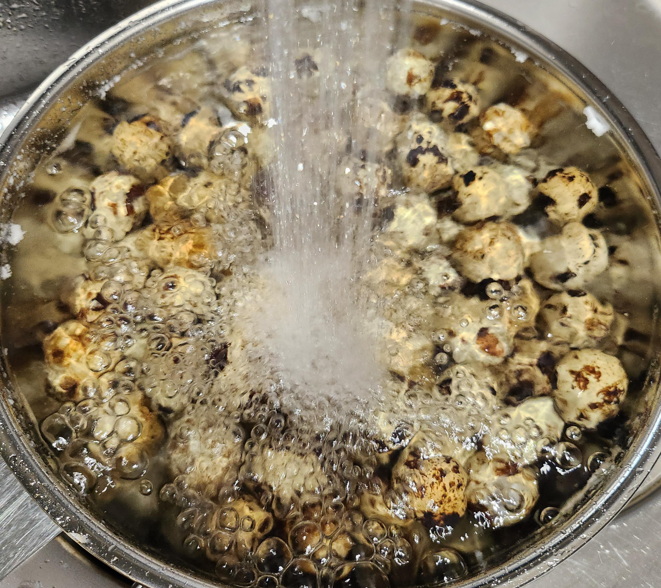 메추리알이 잠길 정도의 물을 넣고 소금 한 스푼을 넣어 13분~15분간 삶아주세요.